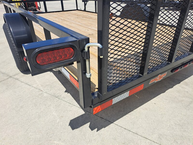 This 82" x 14' single axle utility trailer can haul your mower, your atv, or even your new side by side UTV. This is not a cheap department store trailer. It includes a 2" tube top rail, not angle iron, fully powdercoated, and NATM compliant manufacturing. All LED lighting. The rear gate has an easy to operate latching system that will not corrode and become difficult to use with age and weather.