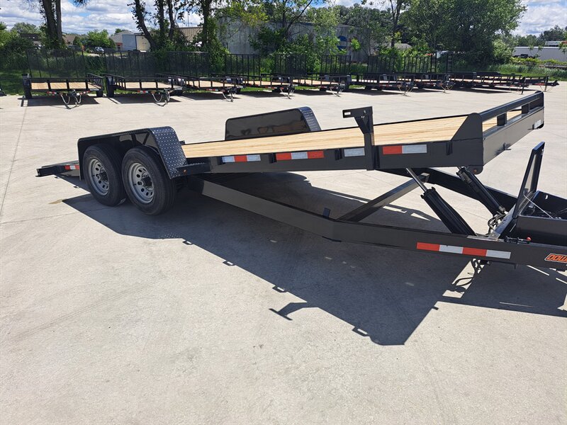 This 82" x 20' tandem axle, 10k, power tilt car hauler trailer is heavy enough to haul even those big vehicles. Self contained electric over hydraulic tilt system with dual hydraulic rams. Adjustable height, heavy duty hitch. Both side fenders easily remove for easing of opening car door on lower vehicles. Trailer is fully powdercoated. All Down2Earth trailers have NATM compliant manufacturing. All LED lighting. Pressure treated wood floor on 2 ft. OC cross members. Spare tire carrier for optional spare tire location.
